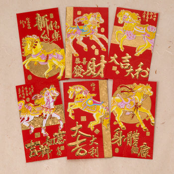 Cheerful and bright, these beautiful red envelopes (also called hongbao) are adorned with horse images and decorated with the Chinese characters of Prosperity, Healthy, Happy New Year, Good Luck, and more.