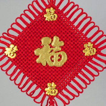 This knotting piece is an essential item in the tradition of festival decorations. The decoration is hung anywhere in homes or businesses to bring in good luck. The character for good luck, 福 (fu), is added to represent the good luck it brings.