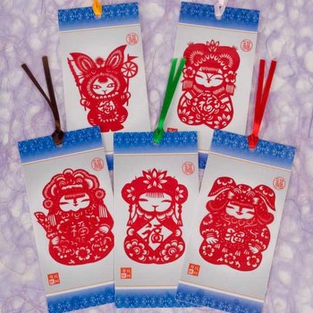 Each of these five papercut bookmarks features a traditional Chinese greeting child holding the Chinese character "Fu" - Good Luck. Each of the girls is dressed in a different outfit and headdress. A unique gift idea for anyone who likes to read.