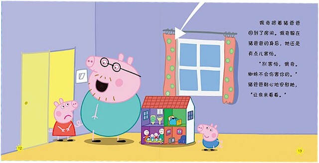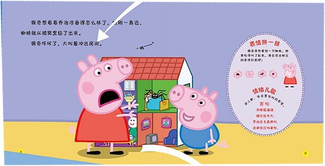 《瘦腿先生》:瘦腿先生是一只蜘蛛。佩奇很害怕蜘蛛,她去找猪爸爸求助。在猪爸爸的安抚下,佩奇不再害怕蜘蛛了,她甚至还邀请瘦腿先生一起参加茶话会呢!本书将帮助小朋友正确认识“害怕”这种情绪,并学会面对的方法。