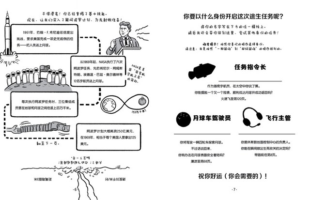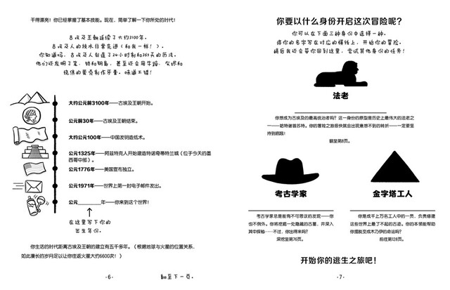 你想穿越回古埃及,沉浸式体验当法老、当金字塔工人吗?你想参与人类伟大的首次登月任务,克服太空中的种种险境吗?或者,你敢不敢登上注定要沉没的泰坦尼克号,挑战能否幸存下来?《逃出这本书!》是一套适合8-12岁孩子的互动游戏书。每本书都是逃生大师发来的挑战,邀请读者参与特定主题的冒险逃生游戏。每本书分别有三种身份,每种身份对应一条任务线,读者可以通过画画、做决定、剪开或翻折书页、解谜来获取线索,选择不同会导致不同的故事走向。读者需要在书页间不停跳跃,寻找线索,直到成功逃生。每本书的逃生任务都基于真实事件创作,所以兼具趣味性和知识性。准备好了吗?逃生大师等你来挑战!