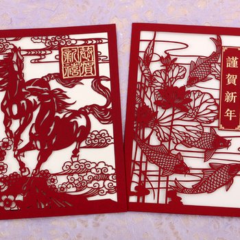 Share happiness and good wishes for the coming year by sending these beautiful greeting cards. Designed in papercut format, one card features two running horses and the other card features fish, the symbol of prosperity, and the Chinese characters Jin He xin Nian - Happy New Year.