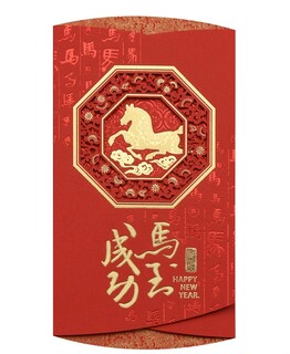 A festive greeting card for the Year of the Horse featuring a red background with gold foil accents and a stylized horse illustration. The design includes traditional decorative elements and “Happy New Year” text in both Chinese and English, incorporating the Chinese idiom 马到成功 (mǎ dào chéng gōng) — “May success come galloping your way!” Inside the card is space for a personal message. Suitable for Lunar New Year celebrations and seasonal gifting.